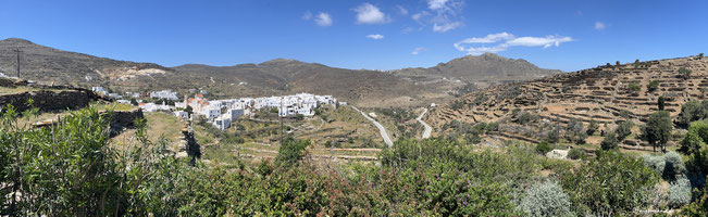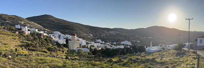 Der Blick zurück offeriert nun den Blick hinab über das Kambos-Tal bis zur Planitis-Insel mit dem Leuchtturm jenseits von Ormos Panormou. Rechts die Häuser des Edelquartiers Glafki Stay. Und weiter rechts die weißen Häuser von Pyrgos, die ich heute noch aus zig Perspektiven werde bewundern können.
